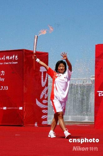 7月13日,北京奧運火炬在齊齊哈爾傳遞,短道速滑世界冠軍付天余在自己的家鄉(xiāng)擔任最后一棒火炬手。 中新社發(fā) 周兆軍 攝