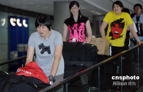 七月十四日中午,在剛剛結(jié)束的世界女排大獎賽中五戰(zhàn)四負,最終僅位列第五的中國女排從日本返回北京。中新社發(fā) 陳文 攝