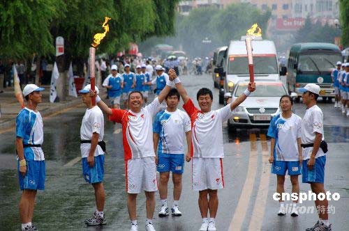 奧運(yùn)火炬吉林市傳遞 滿文軍、杜建華交接火炬