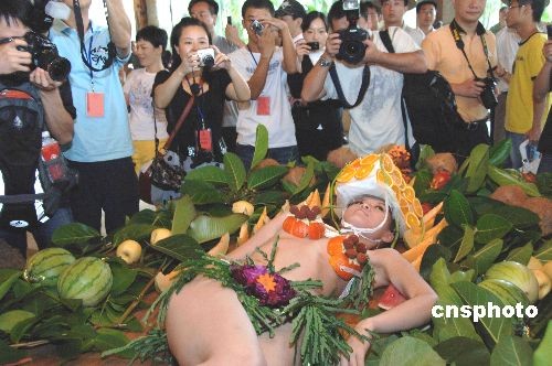 7月16日,廣東佛岡一度假森林舉行首屆“冰果狂歡節(jié)”,當(dāng)天景區(qū)方面特別炮制了一場(chǎng)“水果人體秀”,檸檬、紅蘿卜、櫻桃、西瓜……全都變成了模特身上的衣物, 整個(gè)活動(dòng)圍繞“清涼”主題,將清涼夏日演繹到了極致,令游客大為稱奇。中新社發(fā) 梁永強(qiáng) 攝