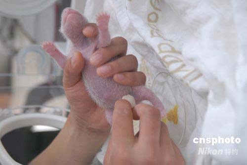 中國(guó)保護(hù)大熊貓研究中心雅安碧峰峽基地工作人員給熊貓幼仔人工排便。中新社發(fā) 羅小韻 攝