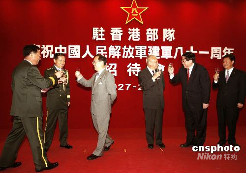 七月三十一日晚,為慶祝中國人民解放軍建軍八十一周年,并感謝特區(qū)政府和香港社會各界長期以來對駐軍的關心與支持,駐港部隊在中環(huán)軍營舉辦了“駐香港部隊慶祝中國人民解放八十一周年招待會”。全國政協副主席董建華、香港特區(qū)行政長官曾蔭權、中聯辦主任高祀任、外交部駐港特派員呂新華、駐港部隊司令員張少波少將、政治委員劉良凱中將等出席了此次招待會。中新社發(fā) 張勤 攝