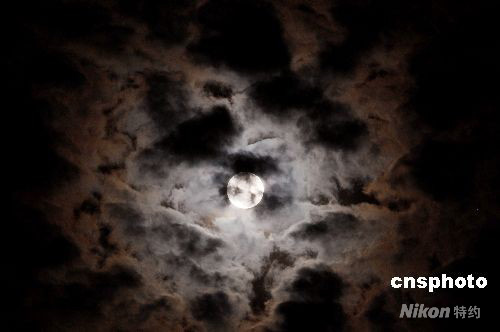 圖為8月17日3時(shí)10分拍攝的半影月食,月球周圍的云彩出現(xiàn)銹紅色光暈。
