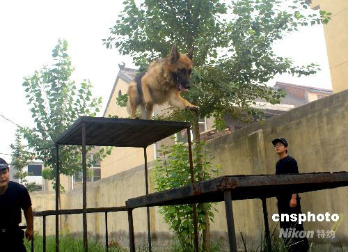 河南省濟(jì)源市刑警支隊舉行“警犬反恐演練”活動。警犬在刑警的帶領(lǐng)下進(jìn)行了穿越障礙、追捕逃犯、嗅覺鑒別等一系列反恐演練科目,大大強(qiáng)化了警犬進(jìn)行反恐實戰(zhàn)的能力。中新社發(fā) 平白 攝