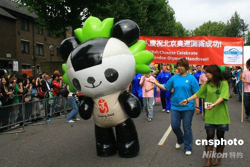 當?shù)貢r間25日,歐洲最大規(guī)模的街頭文化藝術節(jié)——一年一度的英國諾丁山狂歡節(jié)在倫敦舉行。今年的狂歡節(jié)上,當?shù)厝A人團體的盛裝隊伍打出“英國華人慶祝北京奧運圓滿成功”的橫幅,在福娃的帶領下走在狂歡節(jié)所有隊伍的最前面。