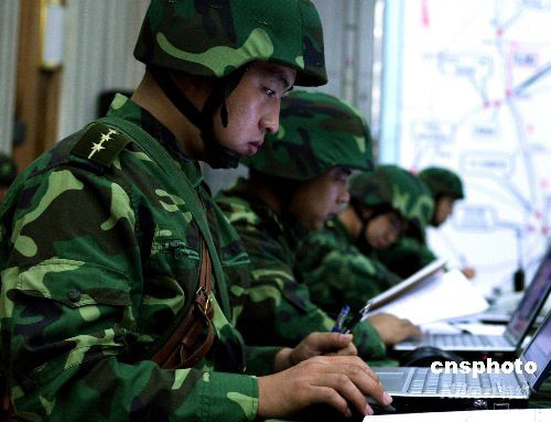 中國人民解放軍“勵兵--2008”演練8月26日拉開帷幕。當日上午濟南軍區(qū)某機械化步兵旅指揮機關向所屬部隊下達了進入戰(zhàn)備狀態(tài)命令,部隊迅速進入戰(zhàn)位嚴整以待,戰(zhàn)備狀態(tài)將隨時升級。中新社發(fā) 宋吉河 攝