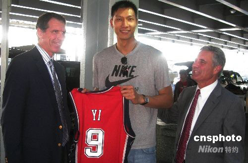 當?shù)貢r間9月8日下午,本賽季將代表新澤西網(wǎng)隊征戰(zhàn)NBA的中國球員易建聯(lián)抵達紐約肯尼迪機場。他將在一周后參加網(wǎng)隊“新秀訓練營”,為新賽季做準備。網(wǎng)隊總經(jīng)理奇奇·范德維奇(左)和執(zhí)行副主席里奧·埃爾萊(右)帶著易建聯(lián)的新球衣到機場迎接。中新社發(fā) 李靜 攝