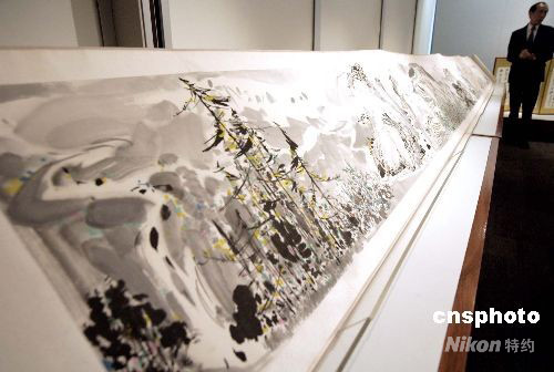 香港蘇富比二〇〇八年秋季中國書畫拍賣會將于十月六日在香港會展中心舉行,拍品總數(shù)超過二百四十件,云集多位書畫名家的優(yōu)秀作品,其中吳冠中、張大千作品成為焦點。圖為九月九日舉行的傳媒預展會上介紹吳冠中《長江萬里圖》,拍賣所得將捐贈“吳冠中科學與藝術創(chuàng)新獎學基金”。中新社發(fā) 張勤 攝