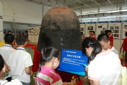 圖為返回式衛(wèi)星實物。實物“焦炭”似的表層,是經(jīng)過地球大氣層時高溫燃燒的結(jié)果。中新社發(fā) 周利朔 攝
