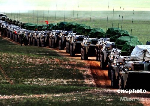 參加“礪兵--2008”演練的解放軍濟(jì)南軍區(qū)某機(jī)械化步兵旅,9月13日至9月17日進(jìn)行摩托化開進(jìn)、陣地火速轉(zhuǎn)移、山地集結(jié)、假想目標(biāo)攻擊訓(xùn)練。中新社發(fā) 宋吉河 攝