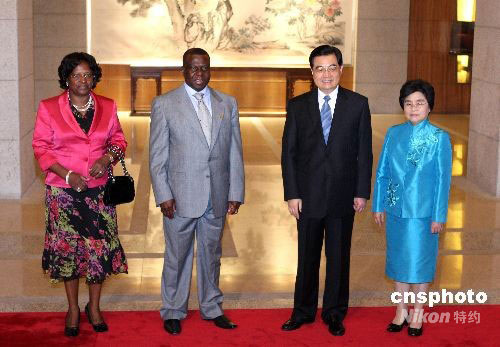 9月17日,中國(guó)國(guó)家主席胡錦濤與夫人劉永清在北京釣魚(yú)臺(tái)國(guó)賓館芳菲苑舉行宴會(huì),歡迎出席北京殘奧會(huì)閉幕式的國(guó)際貴賓。圖為胡錦濤與夫人迎接幾內(nèi)亞比紹總統(tǒng)維埃拉夫婦。中新社發(fā) 廖文靜 攝