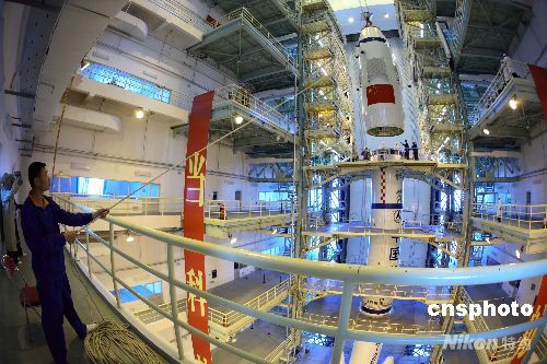 備受矚目的神舟七號(hào)載人航天飛行任務(wù)實(shí)施在即,目前,飛船、火箭、逃逸塔已在酒泉衛(wèi)星發(fā)射中心總裝測(cè)試廠房順利完成對(duì)接。中新社發(fā) 楊志遠(yuǎn) 攝