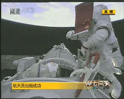 9月27日,“神七”航天員翟志剛在艙外活動(dòng),展出五星紅旗。
