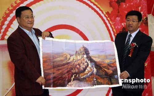 10月1日上午,神舟七號載人飛船返回艙在其誕生地——中國航天科技集團公司所屬中國空間技術(shù)研究院舉行開艙暨搭載物交接儀式,伴隨三位中國航天員太空飛行六十八小時二十七分鐘的一批特殊“乘客”一一精彩亮相,隨后各歸其主。圖為中國載人航天工程載人飛船系統(tǒng)和空間實驗室系統(tǒng)總指揮尚志(右),向有關(guān)方面移交“神七”搭載的油畫《長城》。中新社發(fā) 孫自法 攝