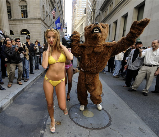 美國劇團(tuán)成員6日裝扮成熊的模樣在紐約證券交易所前表演。