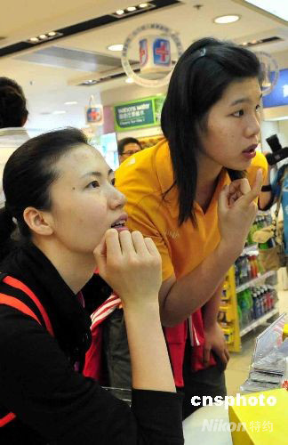 十月九日,中國女排展開訪問香港之旅,圖為隊員周蘇紅(左)等在商場選購化妝品。中新社發(fā) 譚達(dá)明 攝