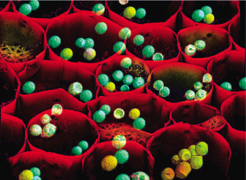 鈴蘭,阿爾伯特·圖森攝,放大1300倍。拍攝地點(diǎn):美國(guó)阿拉巴馬州伯明翰。細(xì)胞學(xué)家圖森已從事顯微攝影25年。圖中,紅色的是細(xì)胞壁,綠色和黃色的是淀粉顆粒。所用技術(shù):共焦。