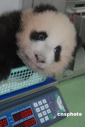 圖為大熊貓幼仔平平(雌性)在稱體重。中新社發(fā) 羅小韻 攝
