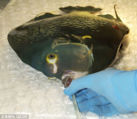 據(jù)英國媒體28日報道,這條長25厘米的雌性天使魚名叫卡拉,在當日的手術過程中,一名獸醫(yī)將其平放在手術臺上,由另外兩名助理醫(yī)生“主刀”。
