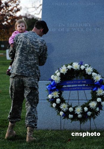 圖為11月11日,美國(guó)傳統(tǒng)的“老兵節(jié)”,一名傷殘的美國(guó)海軍陸戰(zhàn)隊(duì)士兵來(lái)到位于華盛頓特區(qū)一河之隔的弗吉尼亞阿靈頓國(guó)家公墓,抱著孩子給自己在伊拉克犧牲的戰(zhàn)友敬獻(xiàn)花圈。中新社發(fā) 邱江波 攝
