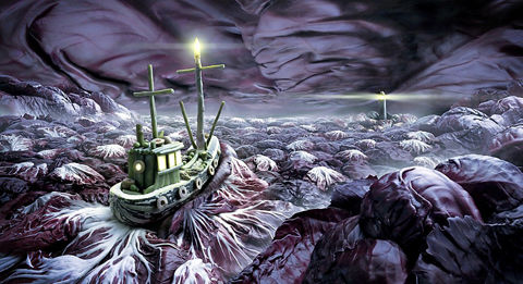狂怒的大海和暴風(fēng)雨天空由紅色卷心菜制成,而船體是一個(gè)小胡瓜,舵手室是嫩豌豆形成的,而桅桿是直立的蘆筍。