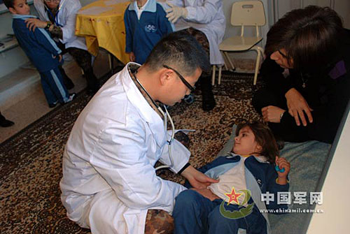 今天體檢的是該校幼兒園的小朋友。上午9點(diǎn)開始,中國維和軍醫(yī)對孩子們的身高、體重、五官、內(nèi)科、外科進(jìn)行了全面體檢,并將檢查結(jié)果詳細(xì)記錄,交給該校老師存檔。皮膚科、婦科醫(yī)生則為慕名而來的當(dāng)?shù)厝罕娺M(jìn)行了義診。至中午12點(diǎn),中國醫(yī)護(hù)人員共為該校幼兒園的100余名小朋友進(jìn)行了體檢,治療20余名皮膚、婦科患者。