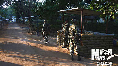 印軍營房的哨位由沙包、三合板和柱子簡單搭建而成。新華軍事記者 李剛 攝