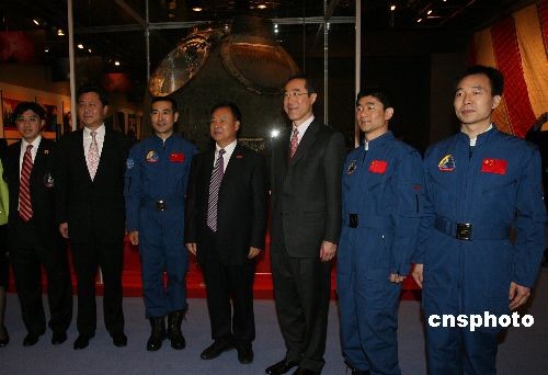 圖為香港政務(wù)司司長唐英年、神舟七號(hào)載人航天飛行赴港代表團(tuán)團(tuán)長暨中國載人航天工程副總指揮張建啟、神七航天員翟志剛、劉伯明、景海鵬等在返回艙前合影。中新社發(fā) 武仲林 攝