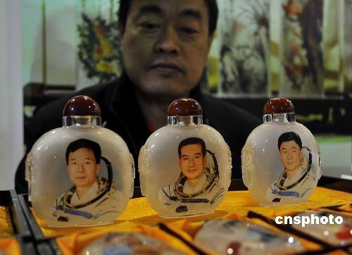 12月18日,第三屆中國北京國際文化創(chuàng)意產(chǎn)業(yè)博覽會(huì)在中國國際展覽中心開幕。該展每年舉辦一次,已成為中外文化創(chuàng)意產(chǎn)業(yè)界相互透視產(chǎn)業(yè)動(dòng)向和趨勢、交流前沿思想理念、傳遞最新政策信息,進(jìn)行產(chǎn)業(yè)合作和產(chǎn)品交易的重要窗口。圖為由河北衡水畫家創(chuàng)作的“神七”航天員肖像鼻煙壺。中新社發(fā) 潘旭臨 攝
