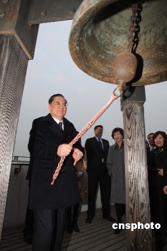 圖:連戰(zhàn)在上海世博局撞“古鐘”