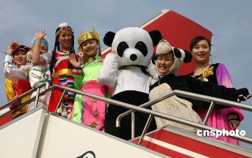 身穿大熊貓服裝和民族服裝的漂亮空姐在客機舷梯上慶賀首航。中新社發(fā) 霍潺 攝