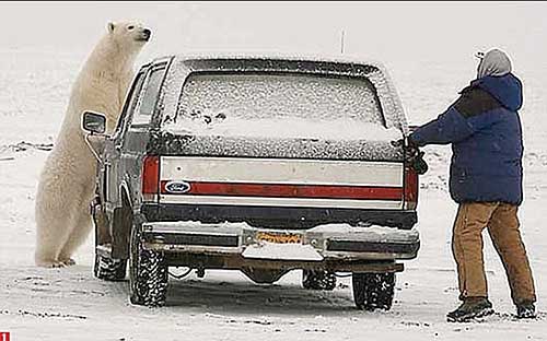 近日,美國(guó)阿拉斯加州一名男子在大雪天駕車出行時(shí),不慎遇到一只強(qiáng)壯的北極熊。這只北極熊饑餓難耐,想拿這名男子當(dāng)“晚餐”,于是北極熊和這名男子在雪地里繞著車展開(kāi)一場(chǎng)“貓捉老鼠”的驚險(xiǎn)游戲。最終男子成功擺脫了北極熊的追逐,死里逃生。這一幕被附近一名攝像師拍攝下來(lái)。