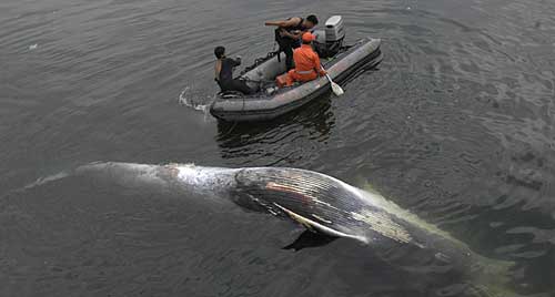 12月30日,菲律賓海岸警衛(wèi)隊(duì)在馬尼拉灣附近打撈起一具罕見的小須鯨尸體。這只重約2噸長約10米的小須鯨的死因可能是與大型渡船相撞或者因?yàn)檠罅鞯淖兓月,這是馬尼拉灣附近首次浮現(xiàn)鯨魚尸體。