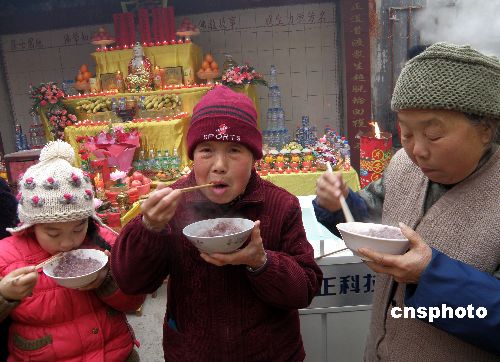 2009年1月3日,農(nóng)歷臘月初八,是中國傳統(tǒng)的臘八節(jié),湖北宜昌三峽古佛寺里準(zhǔn)備了豐盛的臘八粥,眾多名市民在古佛寺里喜吃臘八粥。據(jù)悉,臘八粥又稱佛粥,與佛祖釋迦牟尼得道成佛有關(guān)。臘八粥在民間被視為吉祥食品,寓意一年之末的大豐收及來年風(fēng)調(diào)雨順,吉祥如意。中新社發(fā) 劉君鳳 攝
