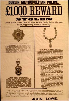 19世紀愛爾蘭國王威廉五世收集了很多珠寶——綠寶石、紅寶石、鉆石,這些珠寶都被安全地放置在都柏林城堡的貝德福德塔里,由阿爾斯特軍事首腦、他的外甥及兩名助手保管。1907年6月18日,教區(qū)牧師稱塔的大門鑰匙不見了。5天之后,一名清潔工在她工作時發(fā)現(xiàn)大門是開的。接著在7月6日,她又發(fā)現(xiàn)了更奇怪的事情:裝滿珠寶的金庫大門在整晚是敞開的。那天下午,牧師和威廉五世的外甥檢查黃金并為圣帕特里克(愛爾蘭圣徒)的領(lǐng)子裝飾珠寶,這時一位門童進來,牧師將鑰匙交與他并讓他完成剩下的珠寶鑲嵌,一分鐘之后,當牧師再次回到金庫時,他發(fā)現(xiàn)所有的珠寶都不見了!