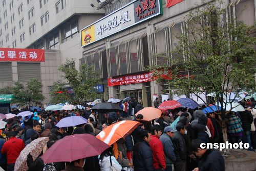 1月7日,在杭州城站火車站的售票大廳門前,排隊購票的人群異常擁擠。由于細雨綿綿的天氣,使得大廳外排起了雨傘購票的長龍。中新社發(fā) 張潔 攝