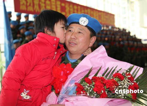 陳長青副大隊長和戰(zhàn)友們將在艱苦的環(huán)境中執(zhí)行任務(wù)8個月,他9歲的女兒陳宇在濟(jì)南機(jī)場和爸爸深情吻別。中新社發(fā) 畢華明 攝
