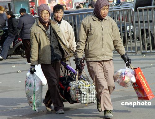 三位農(nóng)民工剛從鄭州火車下車出站,準備返鄉(xiāng)過春節(jié)。