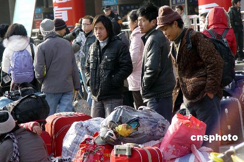 圖為鄭州火車站廣場前幾位等待進站候車的返鄉(xiāng)農(nóng)民工。中新社發(fā) 李志全 攝