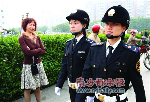 昨日上午9時(shí),掛牌儀式后,22名女隊(duì)員正式開拔上路,全程腰板挺直。中午休息時(shí)間,一臺(tái)臺(tái)電瓶車返回臨時(shí)辦公點(diǎn)后,這群姑娘們終于表現(xiàn)出與年齡相稱的活躍。第一件事是摘下沉重的頭盔,幾乎人手一把梳子,搶位子梳頭、換裝,唧唧喳喳地聊天、打電話,有的則不忘先把今天的首日秀先拍下留念。