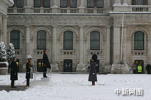 倫敦當(dāng)?shù)貢r(shí)間二月二日上午八時(shí)三十分許,正在對(duì)英國(guó)進(jìn)行正式訪問(wèn)的中國(guó)總理溫家寶,踏雪出席布朗首相在外交部舉行的歡迎儀式。圖為溫家寶在觀禮臺(tái)上檢閱儀仗隊(duì)。 中新社記者 張朔 攝