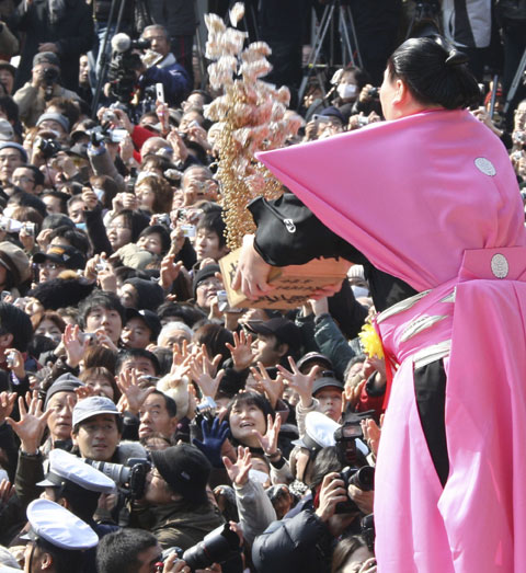 2月3日,在日本靜岡縣熱海市舉行了“撒豆子”儀式,炒熟的黃豆在日本被稱(chēng)為“福豆”,儀式主辦方請(qǐng)來(lái)名人站在高處,將炒熟的黃豆拋向人群,以驅(qū)邪迎福,祈愿身體健康。