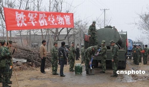 二月六日上午,駐豫六百多名解放軍官兵專程趕赴民眾吃水困難的河南省新鄭市辛店鎮(zhèn)李莊村,將“甘霖”送入民眾家中。二00八年十一月以來(lái),河南省氣偏高,干旱少雨,遭受自一九五一年以來(lái)的特大旱情,農(nóng)作物受旱面積達(dá)到百分之六十三點(diǎn)一,四千一百多萬(wàn)畝麥田受旱災(zāi),部分地區(qū)出現(xiàn)臨時(shí)性人畜飲水困難。