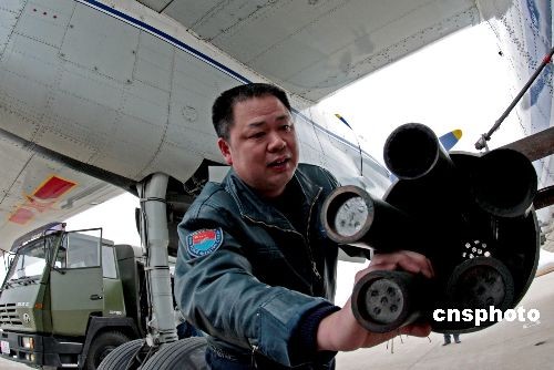 圖為空軍航空兵某師飛行人員認(rèn)真檢查飛機降雨作業(yè)裝置。中新社發(fā) 譚超 攝