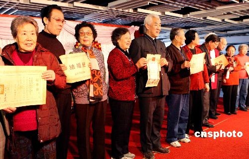 圖為在活動上長者們手捧政府當年頒發(fā)的不同版本的結(jié)婚證相互祝福。中新社發(fā) 錢興強 攝