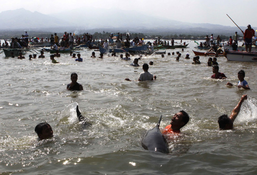 組圖:數(shù)百只海豚被困菲律賓海灘(2)