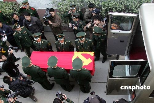 圖為張建勇烈士的靈柩被抬上靈車(chē)。中新社發(fā) 富田 攝