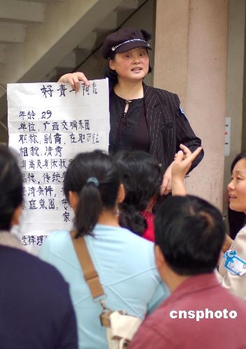 圖為一位媽媽手持簡(jiǎn)介在賣(mài)力地推介自己的“好青年”兒子,吸引眾多相親人士。中新社發(fā) 劉萬(wàn)強(qiáng) 攝