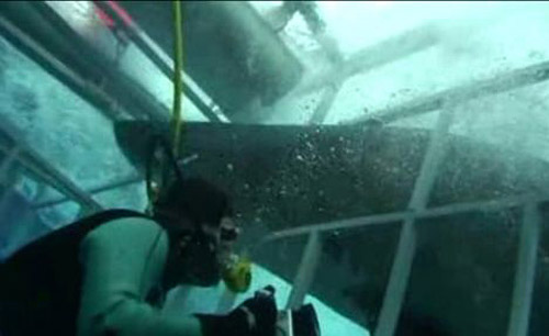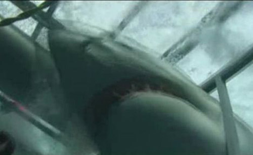 這一令人驚恐的事件是在兩名潛水者參加旅游公司所組織的“極限鯊魚深潛體驗(yàn)游”時(shí)發(fā)生的,他們當(dāng)時(shí)正在觀看那頭體重達(dá)2噸的大白鯊捕食金槍魚。一頭長4.5米的大白鯊?fù)蝗幌蚪饘傧溆蝸,大白鯊的頭部穿過了鐵欄桿,將鐵欄桿撞斷,兩名潛水者不得不趕緊逃生。
