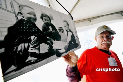 圖為志愿者在展示一張被羈留的中國(guó)兒童移民在此生活的歷史照片。